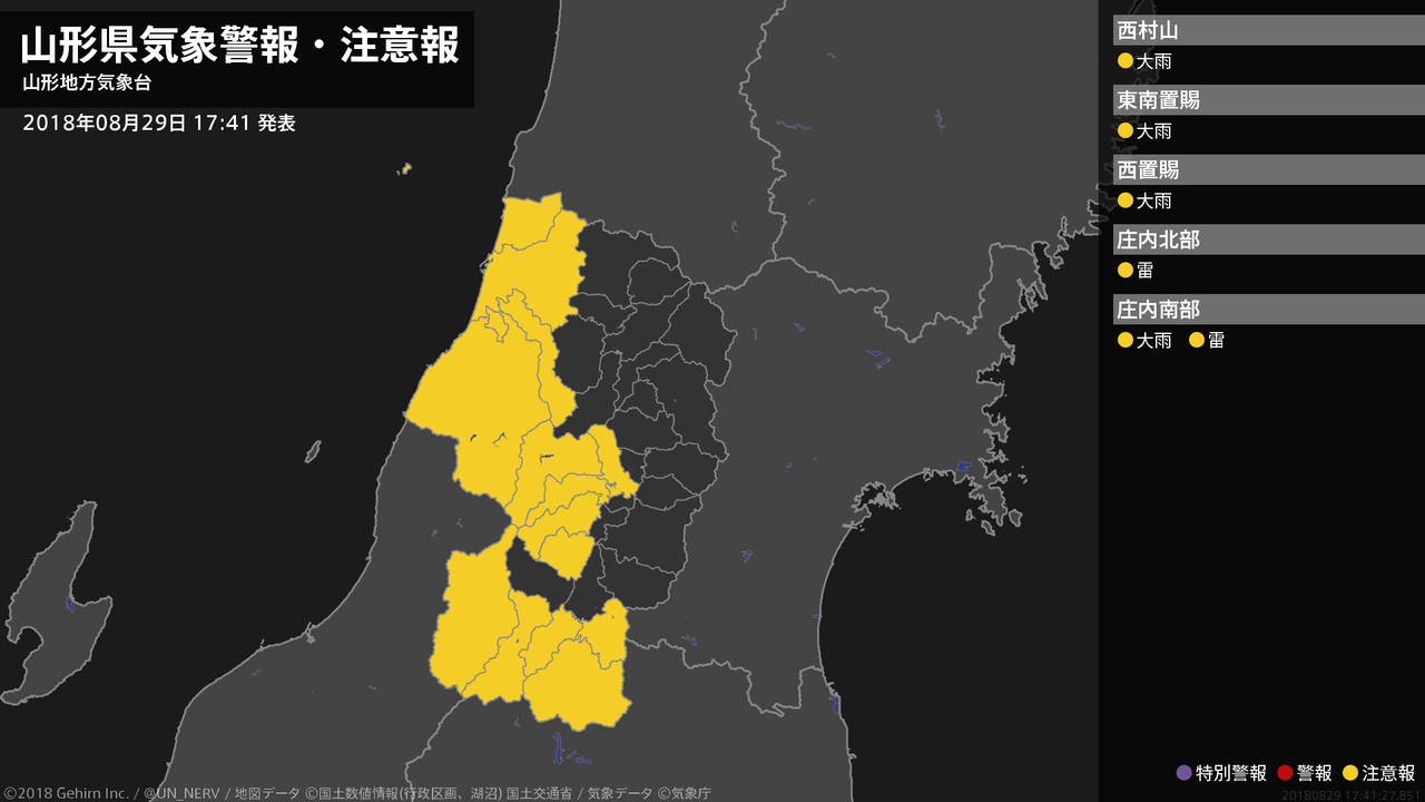 【山形県 気象警報・注意報 2018年08月29日 17:41】村山、置賜、庄内では、29日夜遅くまで土砂災害に注意してください。庄内では、30日未明から落雷に注意してください。#気象警報注意報 #山形県