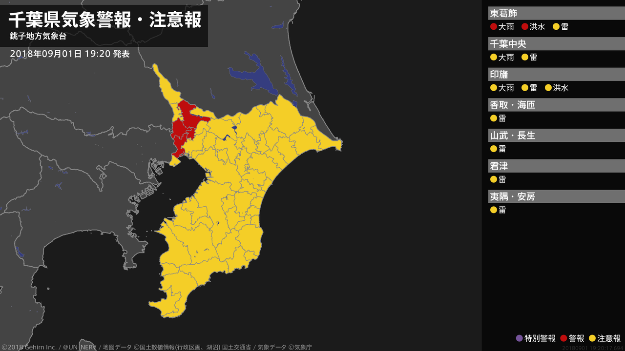 【千葉県 気象警報・注意報 2018年09月01日 19:20】北西部では、1日夜のはじめ頃まで低い土地の浸水や河川の増水に警戒してください。#気象警報注意報 #千葉県