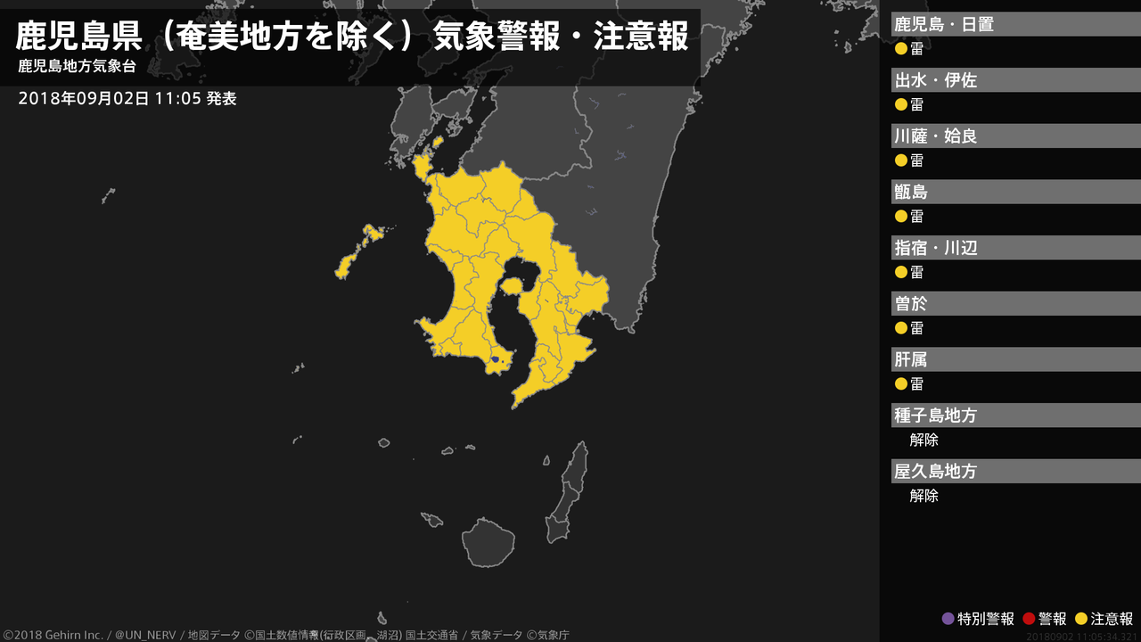 【鹿児島県(奄美地方を除く) 気象警報・注意報 2018年09月02日 11:05】