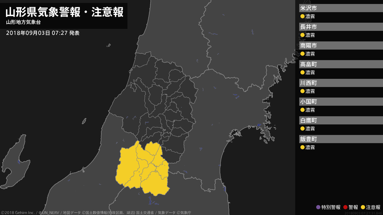 【山形県 気象警報・注意報 2018年09月03日 07:27】