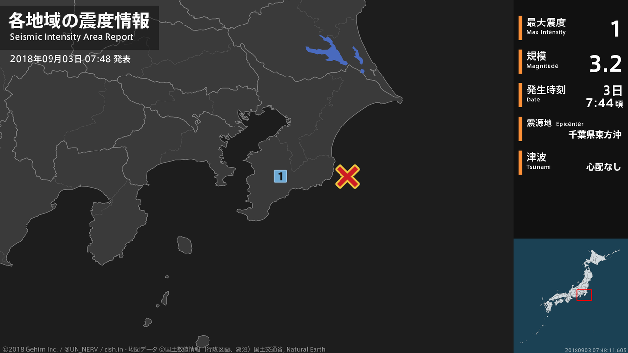 7時44分頃、千葉県東方沖を震源とする地震がありました。震源の深さは約60km、地震の規模はM3.2、最大震度1を千葉県で観測しています。この地震による津波の心配はありません。