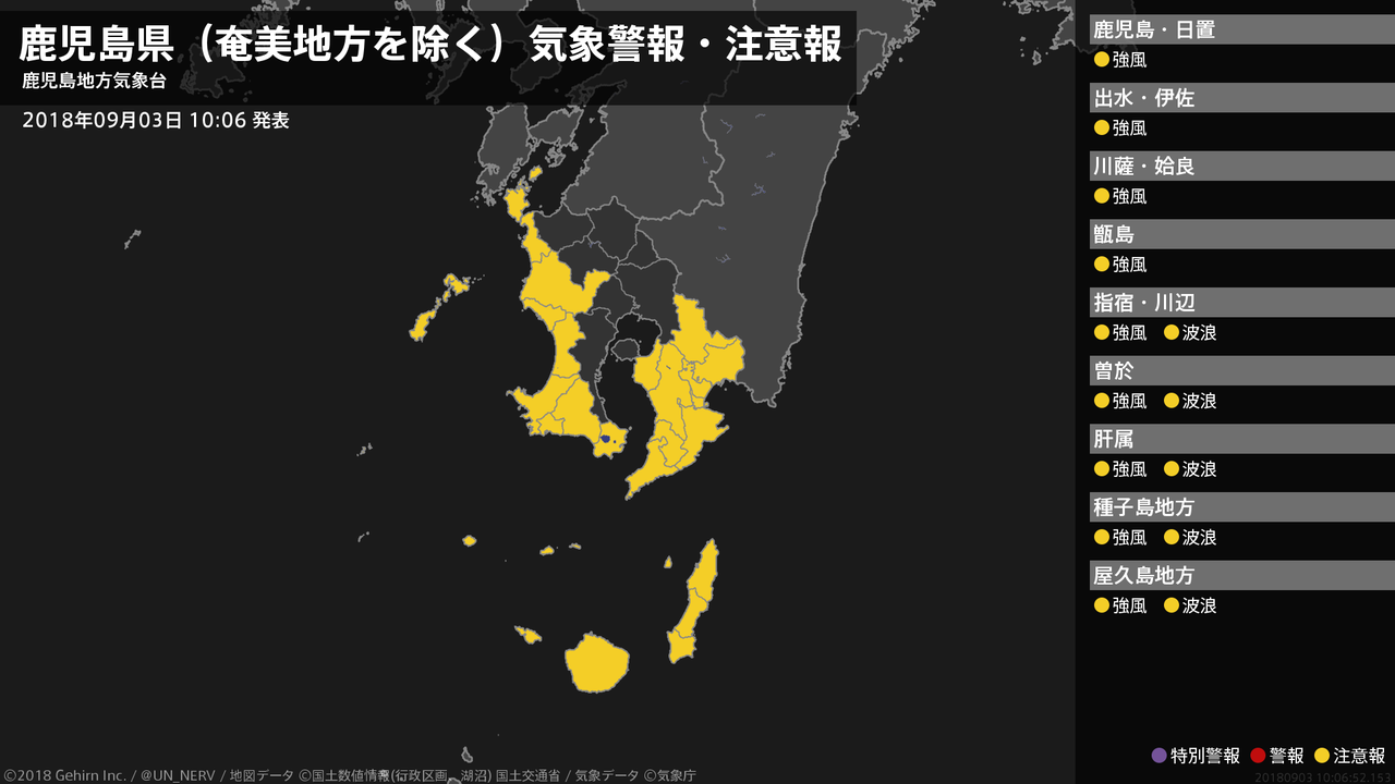 【鹿児島県(奄美地方を除く) 気象警報・注意報 2018年09月03日 10:06】