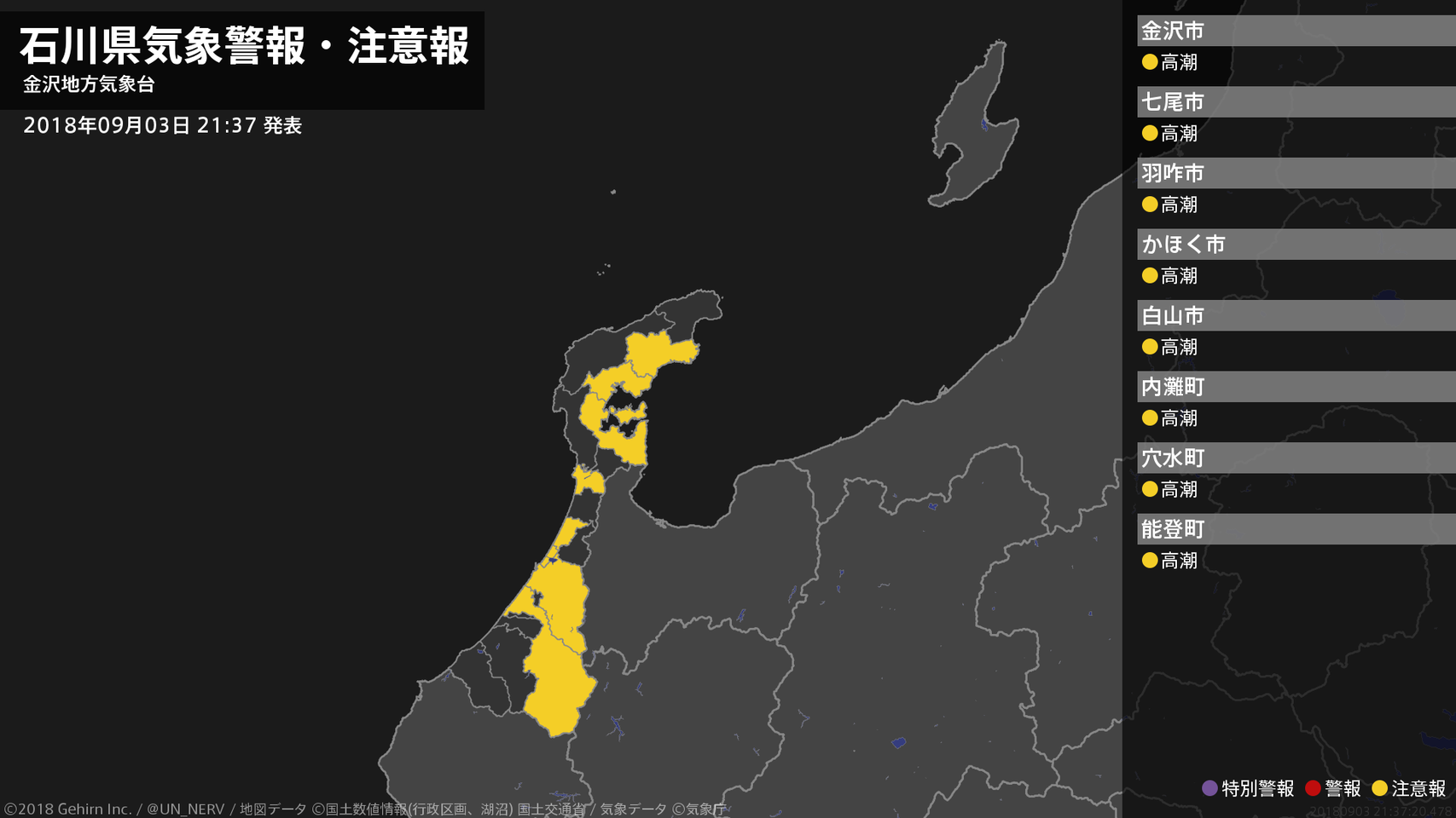 【石川県 気象警報・注意報 2018年09月03日 21:37】石川県では、4日明け方から高潮に注意してください。#気象警報注意報 #石川県