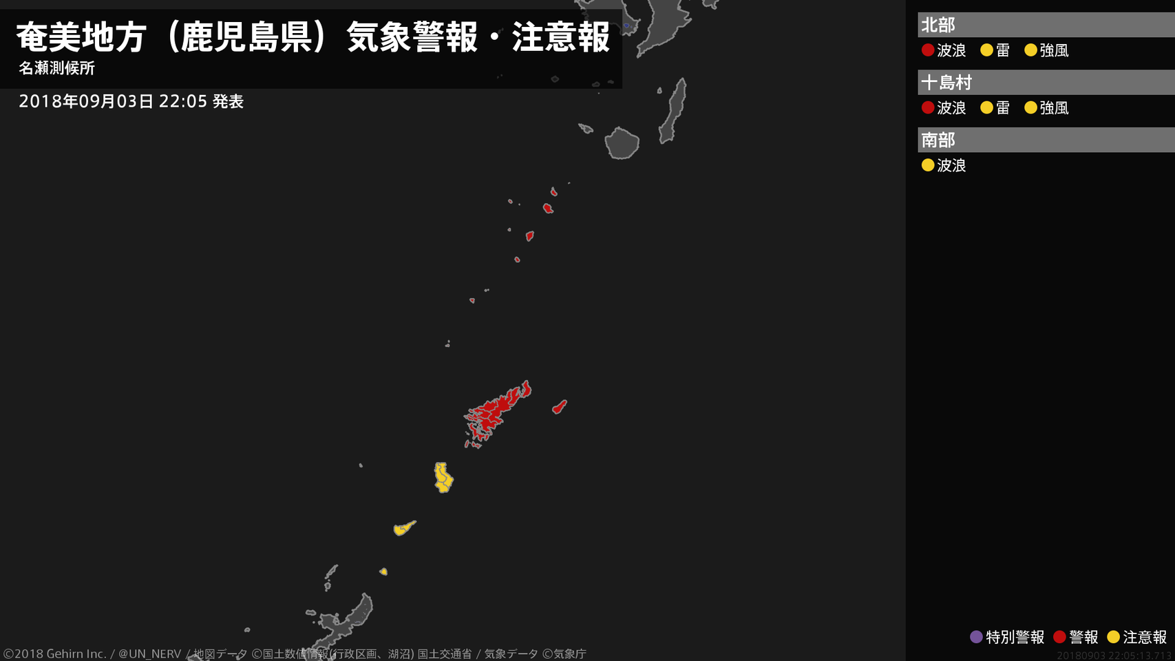 【奄美地方(鹿児島県) 気象警報・注意報 2018年09月03日 22:05】奄美地方では、4日未明まで高波に警戒してください。#気象警報注意報 #奄美地方