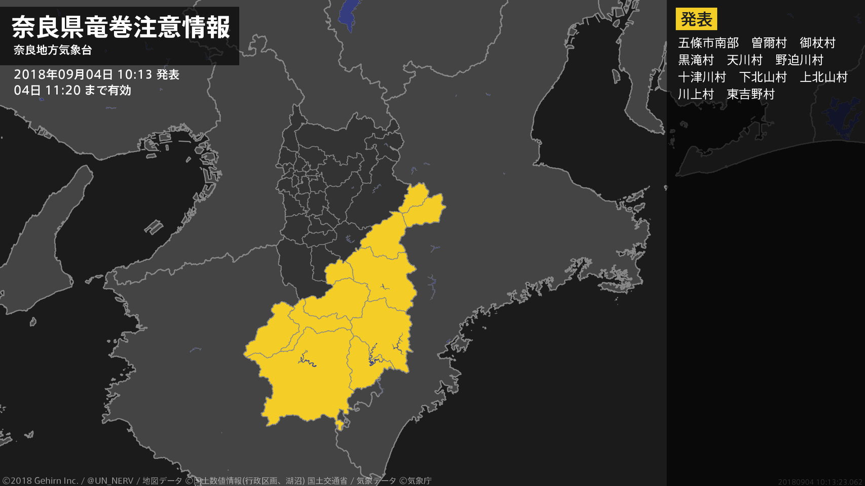 【奈良県 竜巻注意情報】奈良県は、竜巻などの激しい突風が発生しやすい気象状況になっています。頑丈な建物内に移動するなど安全確保に努めてください。この情報は04日11:20まで有効です。#竜巻注意情報 #奈良県