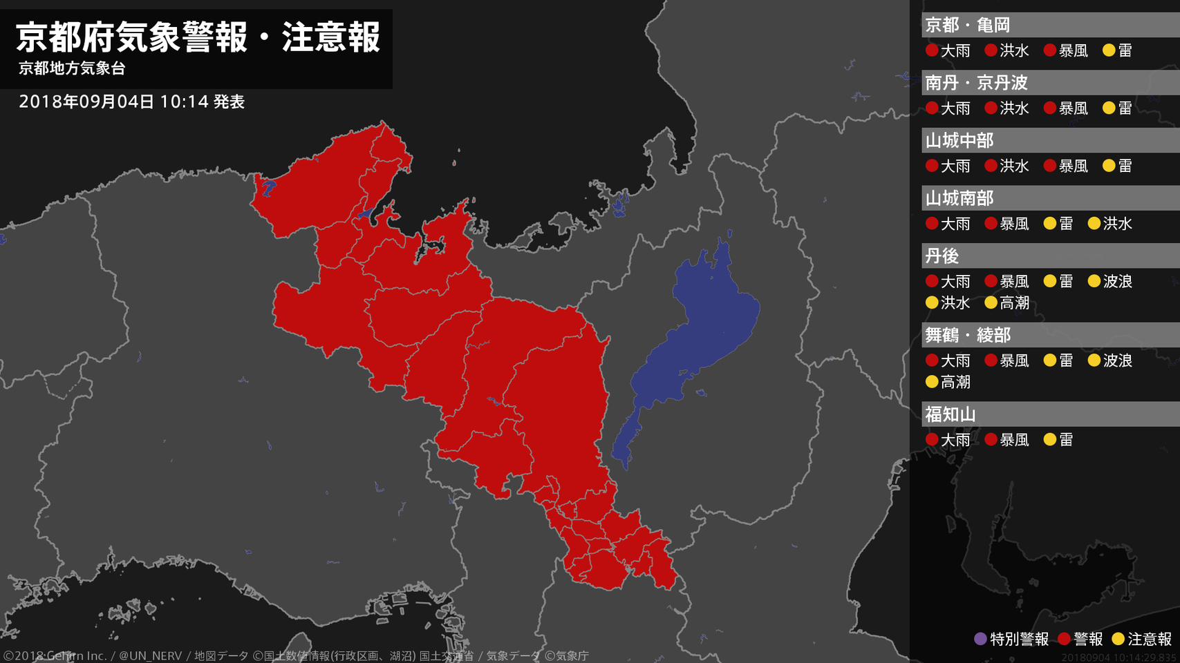 【京都府 気象警報 2018年09月04日 10:14】京都府では、土砂災害や低い土地の浸水、暴風に警戒してください。南部では、河川の増水に警戒してください。#気象警報 #気象警報注意報 #京都府