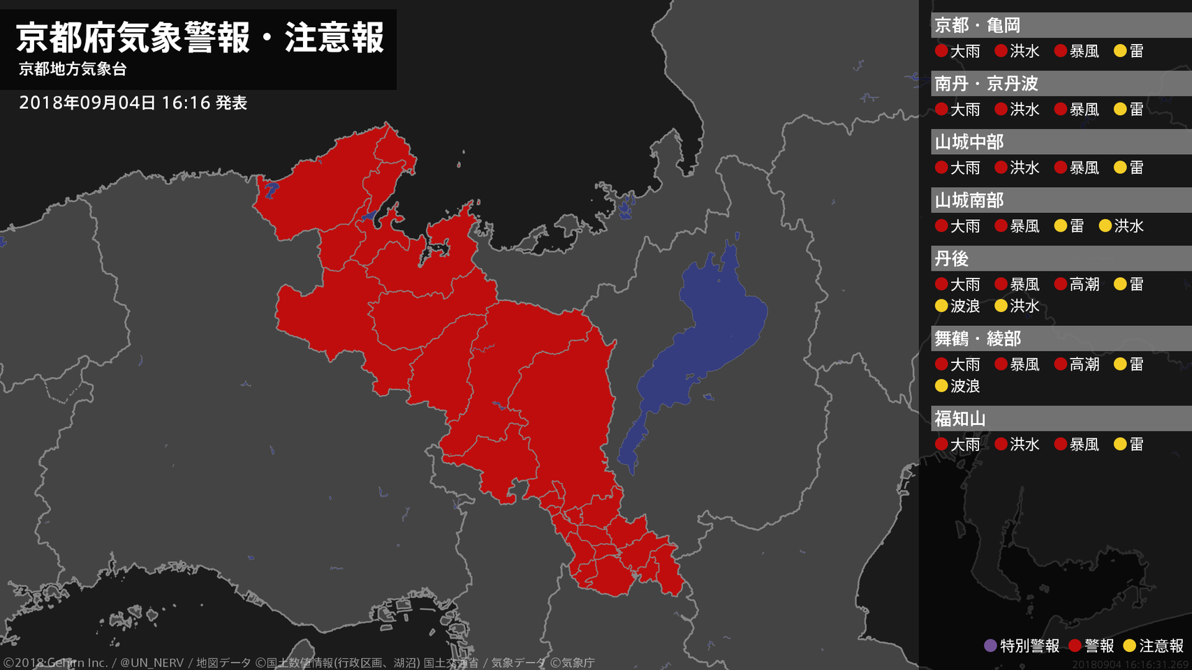 【京都府 気象警報・注意報 2018年09月04日 16:16】京都府では、5日明け方まで土砂災害に、4日夕方まで低い土地の浸水に、4日夜のはじめ頃まで河川の増水や暴風、高潮に警戒してください。#気象警報注意報 #京都府