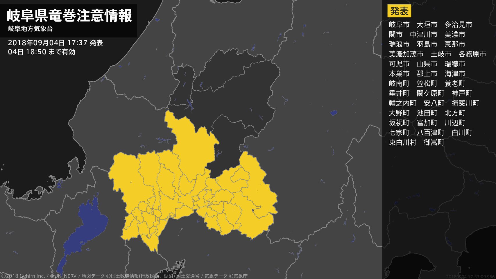 【岐阜県 竜巻注意情報】岐阜県は、竜巻などの激しい突風が発生しやすい気象状況になっています。頑丈な建物内に移動するなど安全確保に努めてください。この情報は04日18:50まで有効です。#竜巻注意情報 #岐阜県