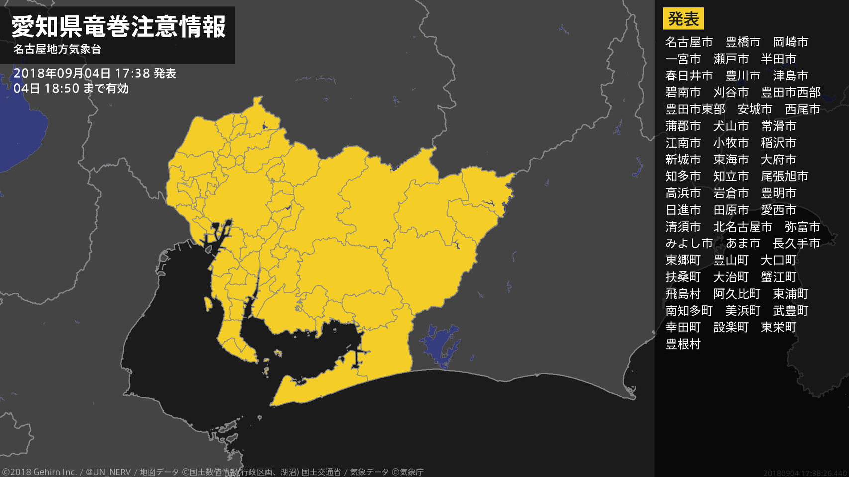 【愛知県 竜巻注意情報】愛知県は、竜巻などの激しい突風が発生しやすい気象状況になっています。頑丈な建物内に移動するなど安全確保に努めてください。この情報は04日18:50まで有効です。#竜巻注意情報 #愛知県