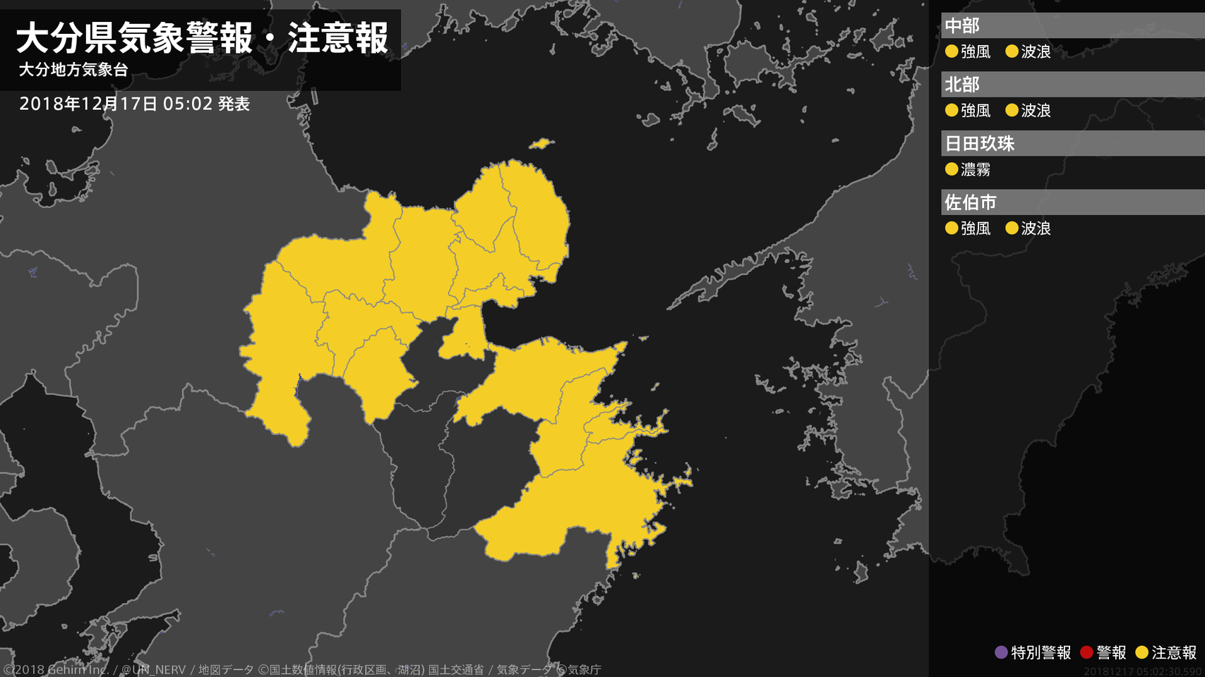 【大分県 気象警報・注意報 2018年12月17日 05:02】中部、北部、南部では、強風や高波に注意してください。西部では、濃霧による視程障害に注意してください。#気象警報注意報 #大分県