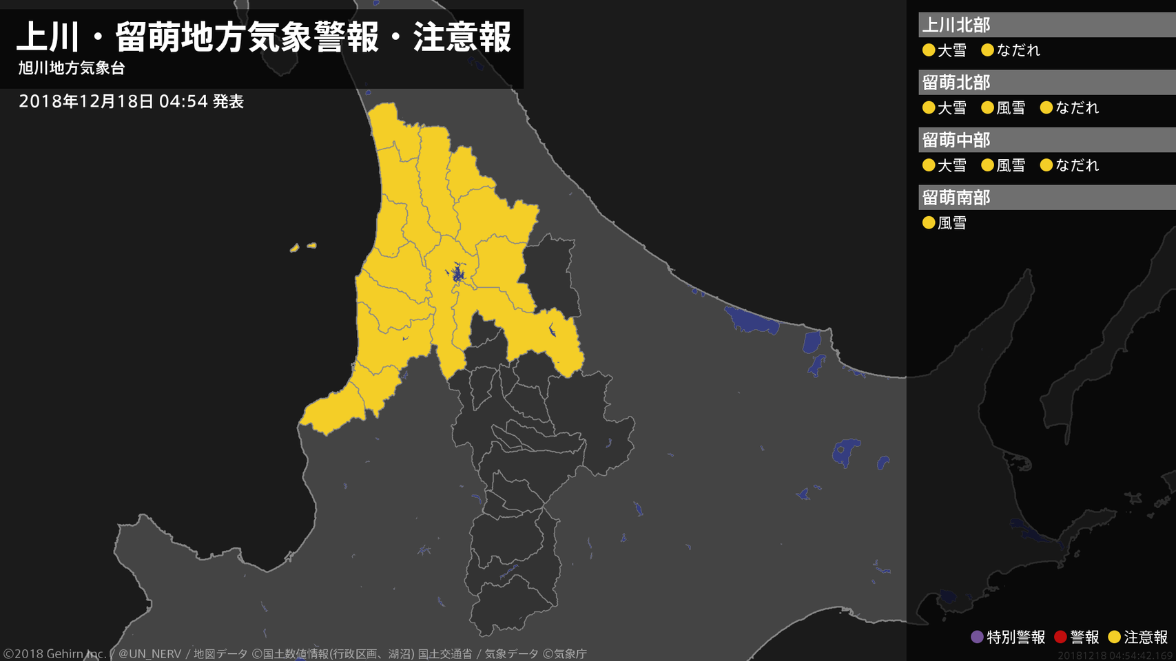 【上川・留萌地方 気象警報・注意報 2018年12月18日 04:54】留萌地方では、18日昼前から風雪に注意してください。上川、留萌地方では、18日朝から19日明け方まで大雪に、19日までなだれに注意してください。#気象警報注意報 #上川地方 #留萌地方