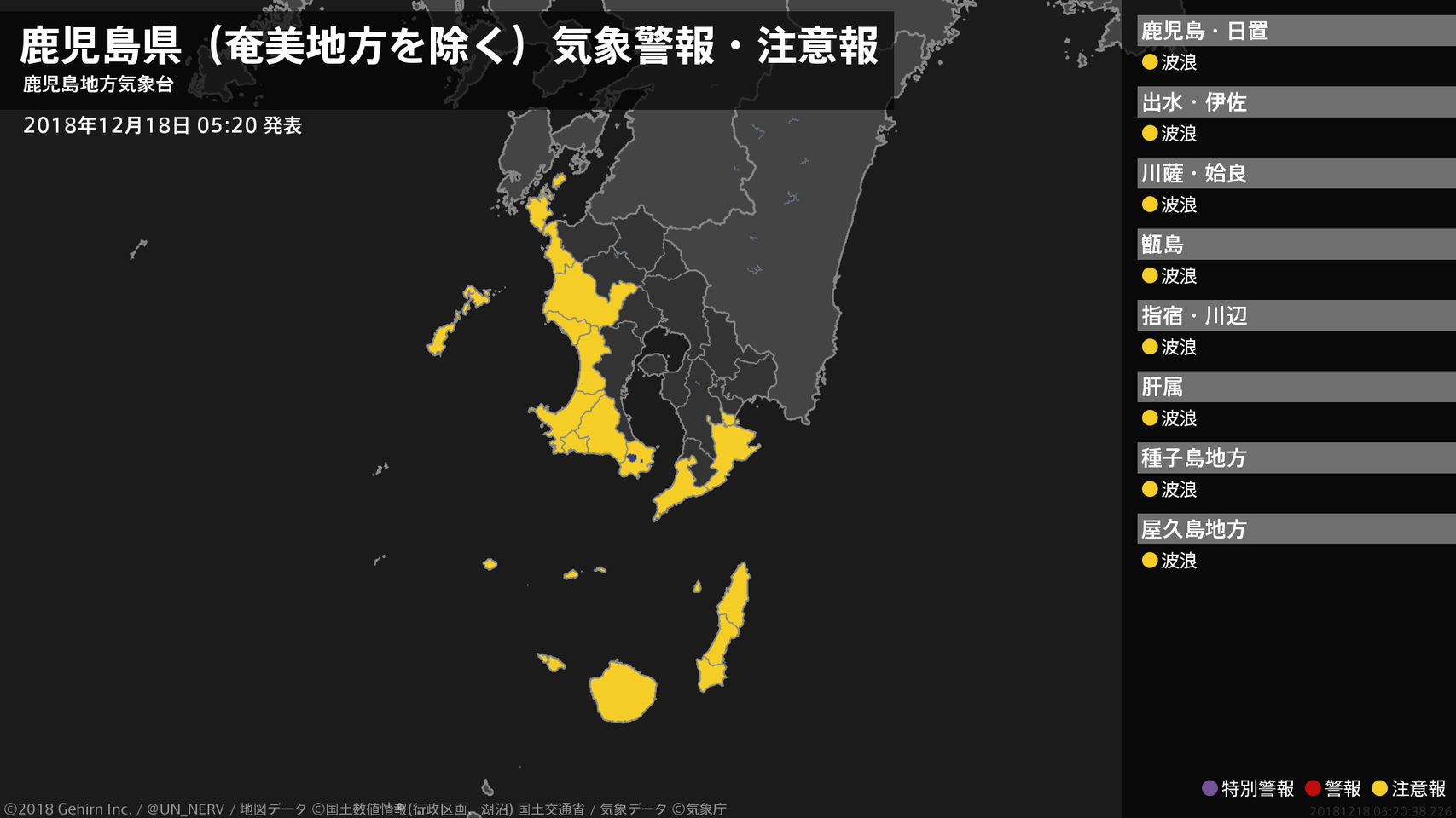【鹿児島県(奄美地方を除く) 気象警報・注意報 2018年12月18日 05:20】薩摩、大隅地方では18日朝まで、種子島・屋久島地方では18日昼前まで、高波に注意してください。#気象警報注意報 #鹿児島県(奄美地方除く)