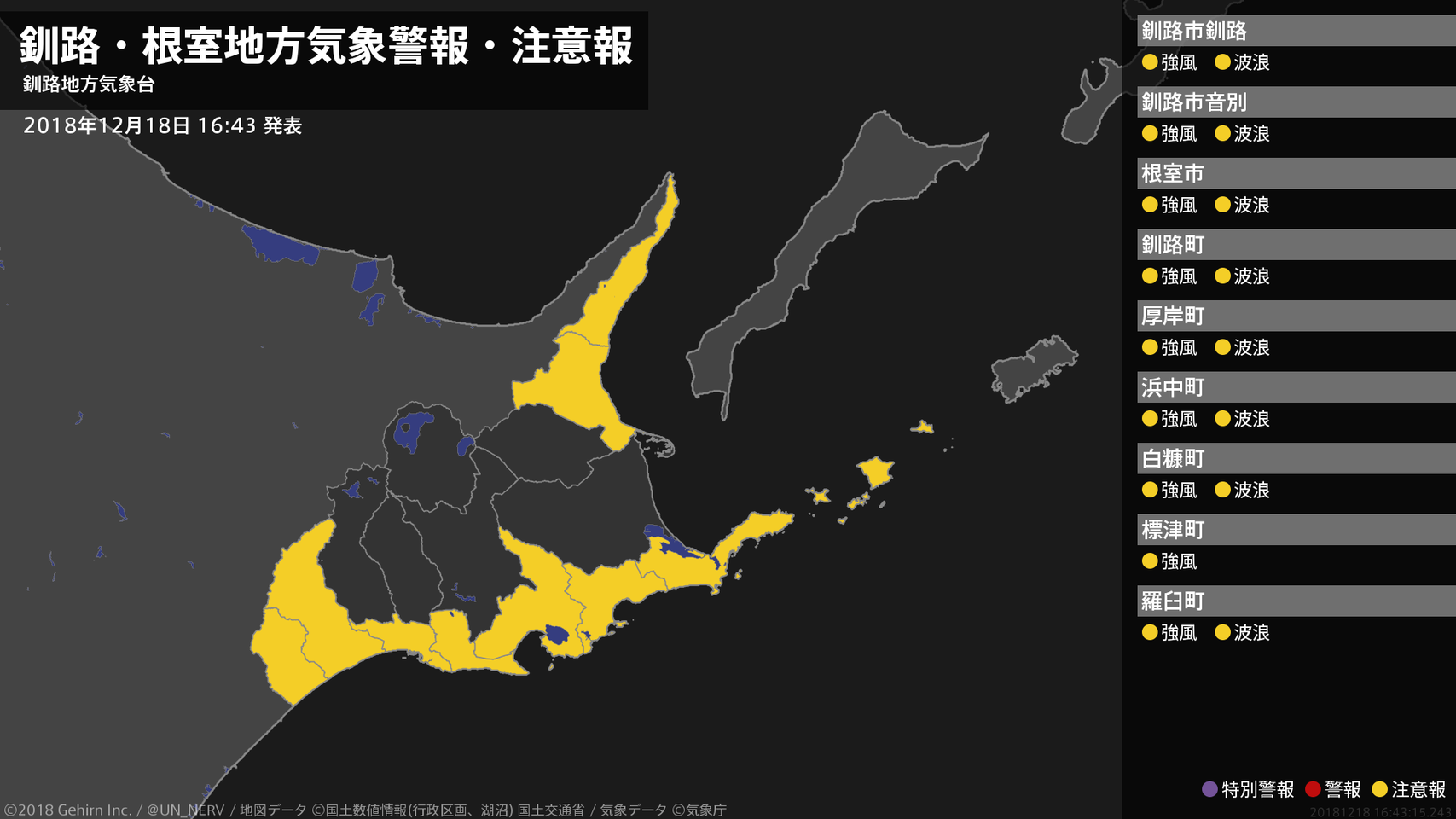 【釧路・根室地方 気象警報・注意報 2018年12月18日 16:43】根室、釧路地方では、強風や高波に注意してください。#気象警報注意報 #根室地方 #釧路地方