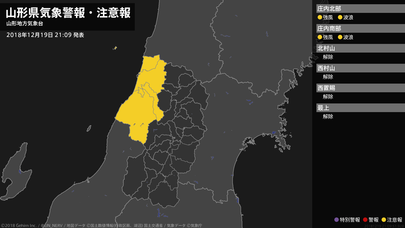 【山形県 気象警報・注意報 2018年12月19日 21:09】庄内では、20日昼前まで強風に、20日夕方まで高波に注意してください。#気象警報注意報 #山形県