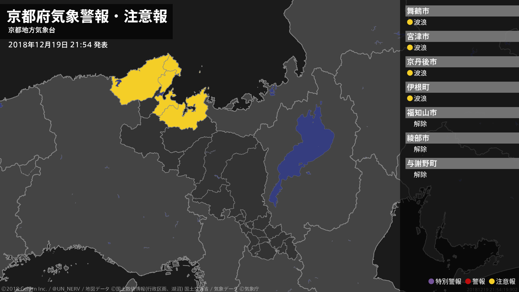 【京都府 気象警報・注意報 2018年12月19日 21:54】北部では、20日明け方まで高波に注意してください。#気象警報注意報 #京都府