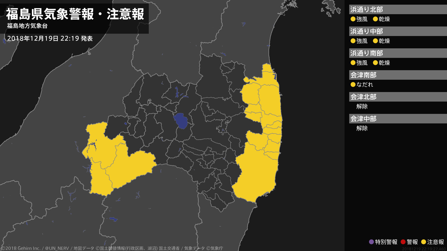 【福島県 気象警報・注意報 2018年12月19日 22:19】浜通りでは、20日昼前まで強風に、ここしばらく空気の乾燥による火の取り扱いに注意してください。会津では、20日までなだれに注意してください。#気象警報注意報 #福島県
