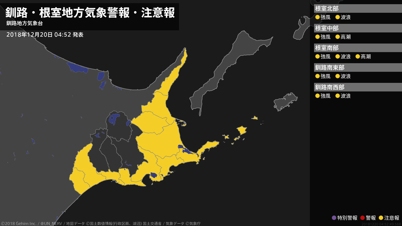 【釧路・根室地方 気象警報・注意報 2018年12月20日 04:52】根室、釧路地方では、強風や高波に注意してください。根室地方では、高潮に注意してください。#気象警報注意報 #根室地方 #釧路地方