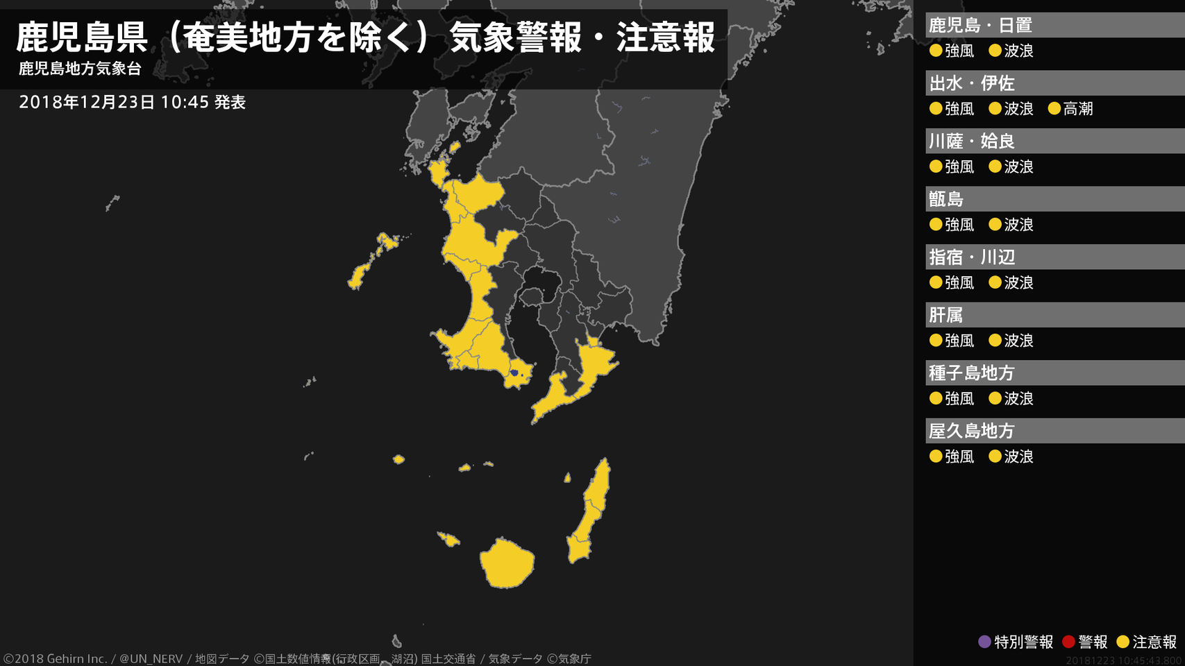 【鹿児島県(奄美地方を除く) 気象警報・注意報 2018年12月23日 10:45】