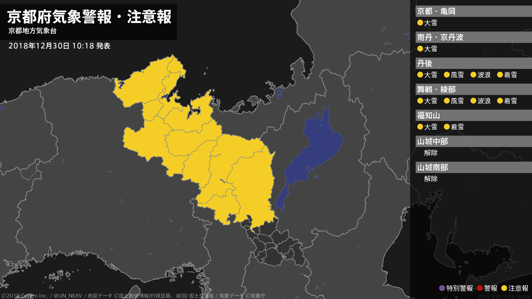 【京都府 気象警報・注意報 2018年12月30日 10:18】北部では、30日夕方まで風雪や電線等への着雪に、31日明け方まで高波に注意してください。京都府では、30日夕方まで大雪に注意してください。#気象警報注意報 #京都府