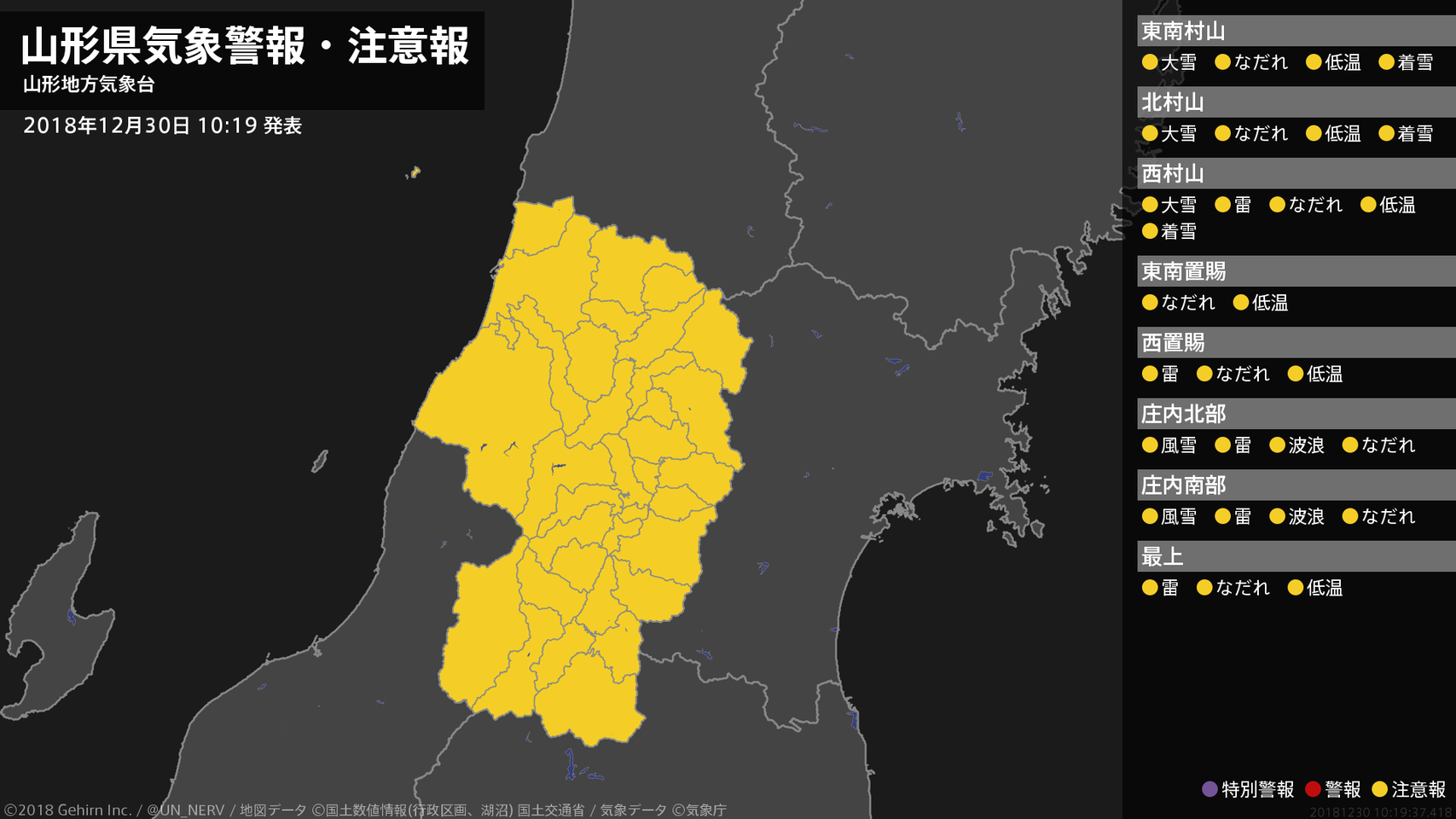【山形県 気象警報・注意報 2018年12月30日 10:19】庄内では、風雪や高波に注意してください。村山では、大雪や電線等への着雪に注意してください。山形県では、落雷やなだれに注意してください。村山、置賜、最上では、低温に注意してください。#気象警報注意報 #山形県