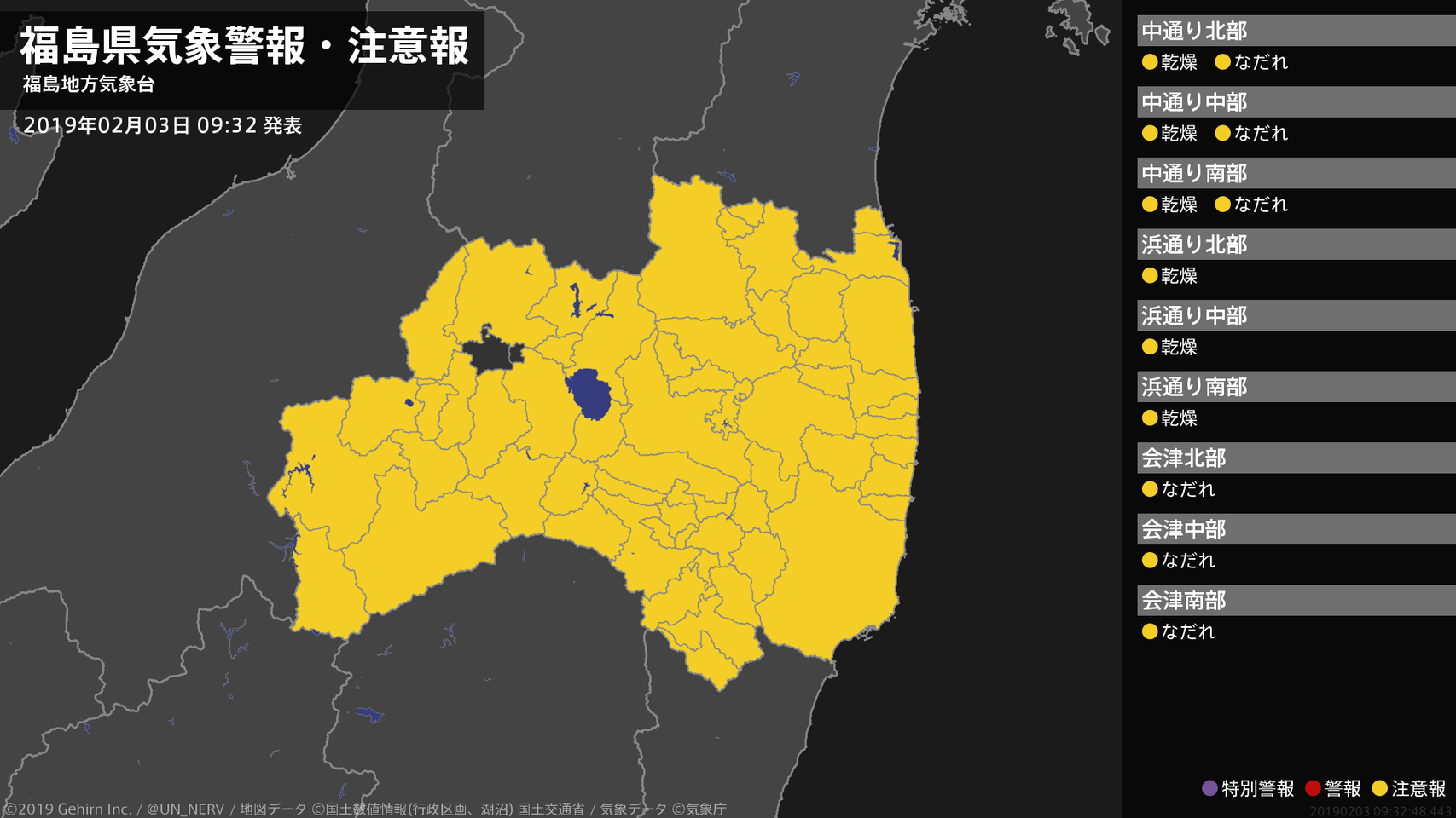 【福島県 気象警報・注意報 2019年02月03日 09:32】中通りでは3日まで、浜通りではここしばらく、空気の乾燥による火の取り扱いに注意してください。中通り、会津では、4日までなだれに注意してください。#気象警報注意報 #福島県