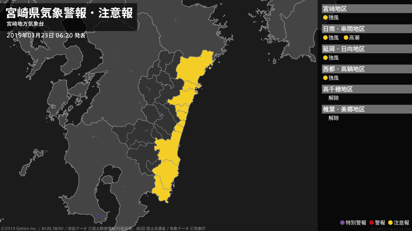 【宮崎県 気象警報・注意報 2019年03月23日 06:20】南部平野部、北部平野部では、23日夜遅くまで強風に注意してください。南部平野部では、23日朝まで高潮に注意してください。#気象警報注意報 #宮崎県