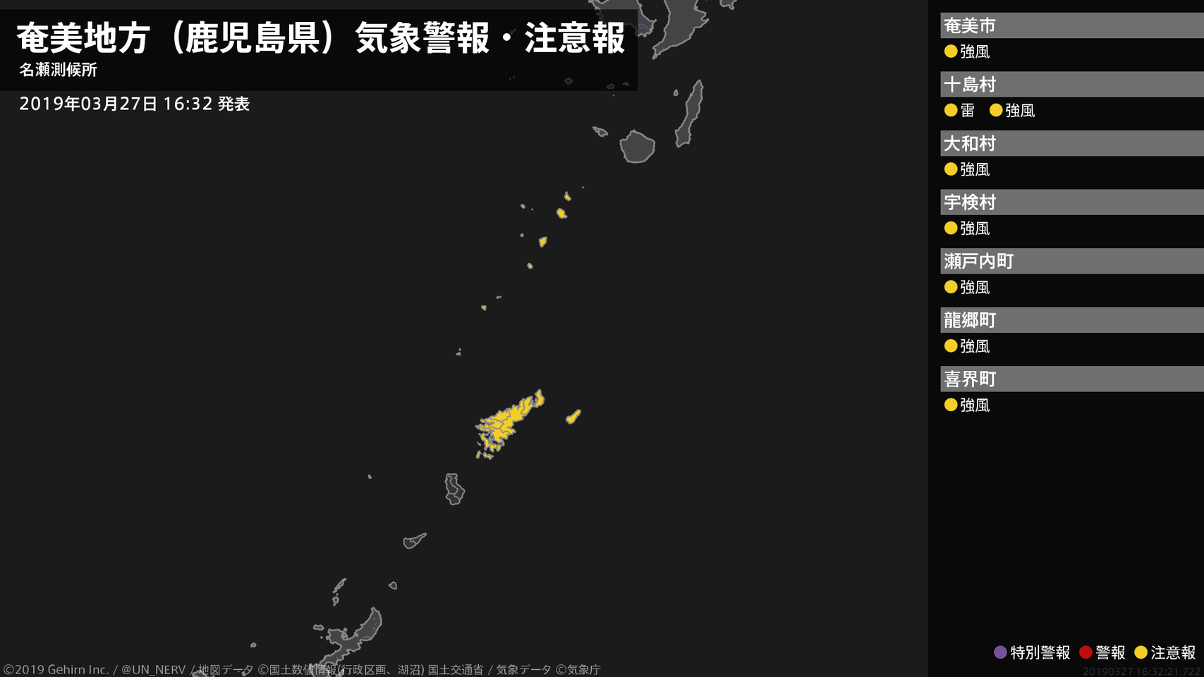 【奄美地方(鹿児島県) 気象警報・注意報 2019年03月27日 16:32】奄美地方では、28日明け方から28日昼前まで強風や急な強い雨、落雷に注意してください。#気象警報注意報 #奄美地方