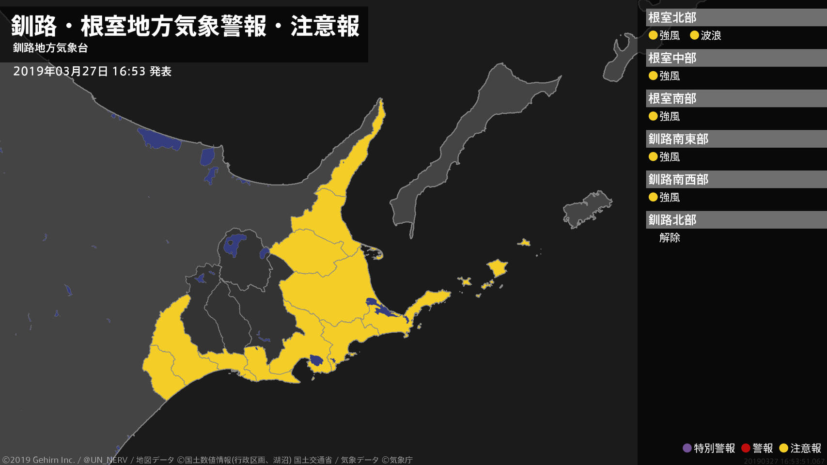 【釧路・根室地方 気象警報・注意報 2019年03月27日 16:53】根室、釧路地方では、27日夜のはじめ頃まで強風に注意してください。根室地方では、27日夜のはじめ頃まで高波に注意してください。#気象警報注意報 #根室地方 #釧路地方