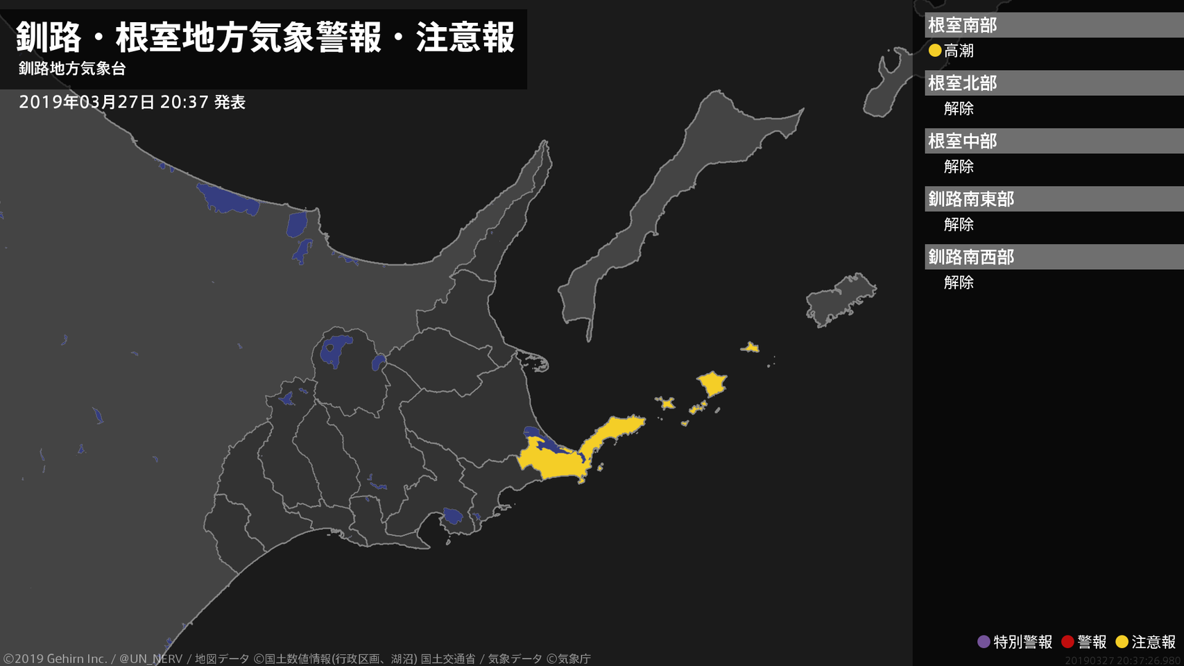 【釧路・根室地方 気象警報・注意報 2019年03月27日 20:37】根室地方では、28日明け方から28日朝まで高潮に注意してください。#気象警報注意報 #根室地方 #釧路地方