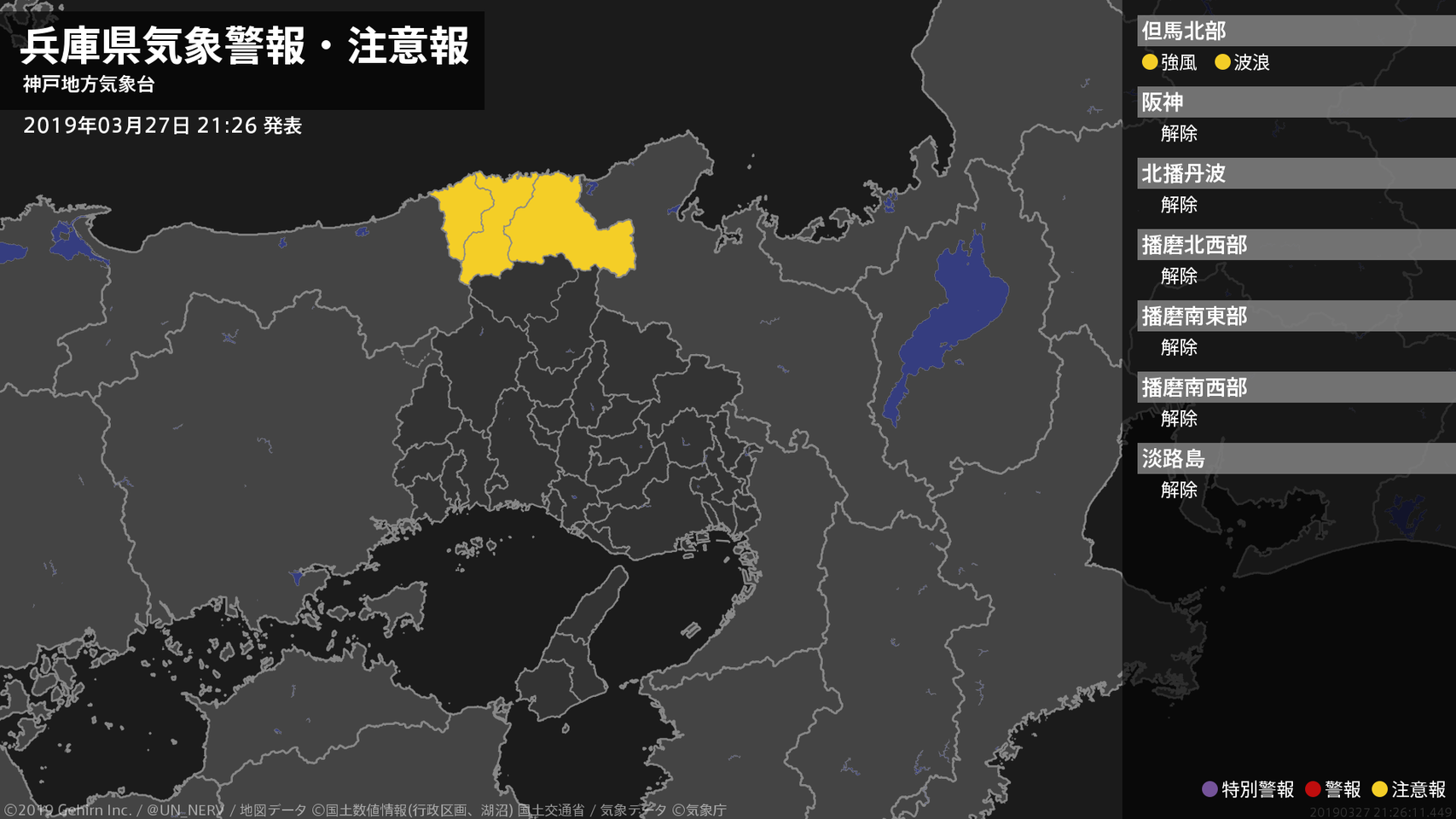 【兵庫県 気象警報・注意報 2019年03月27日 21:26】北部では、28日明け方まで強風や高波に注意してください。#気象警報注意報 #兵庫県