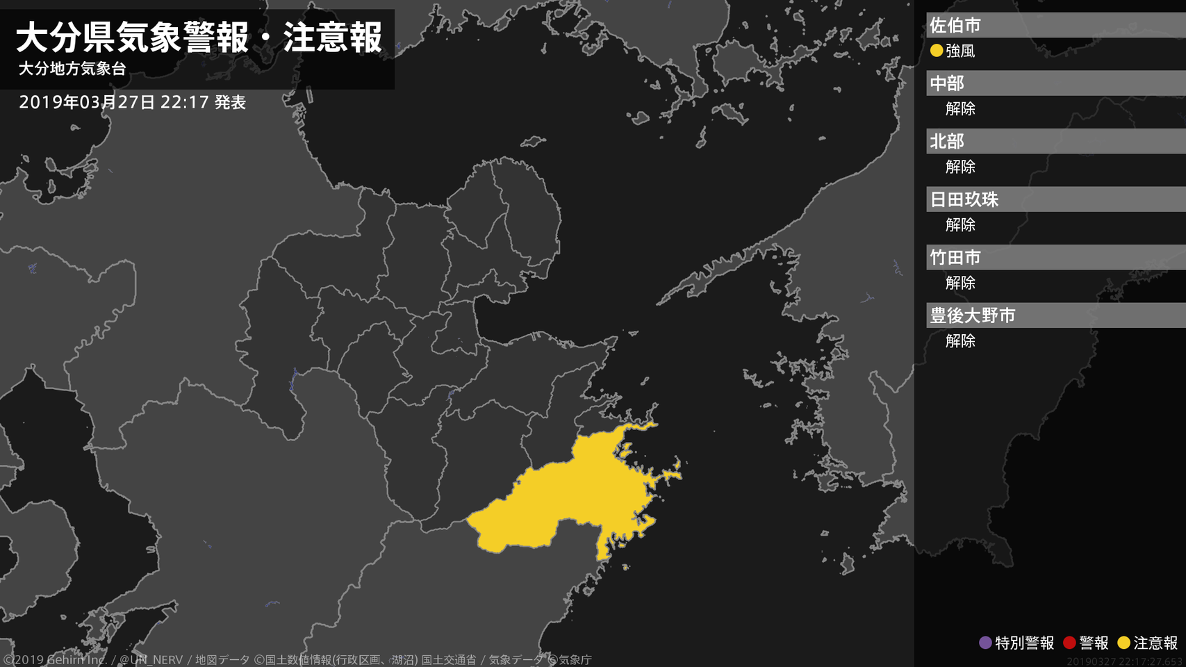【大分県 気象警報・注意報 2019年03月27日 22:17】南部では、28日明け方まで強風に注意してください。#気象警報注意報 #大分県