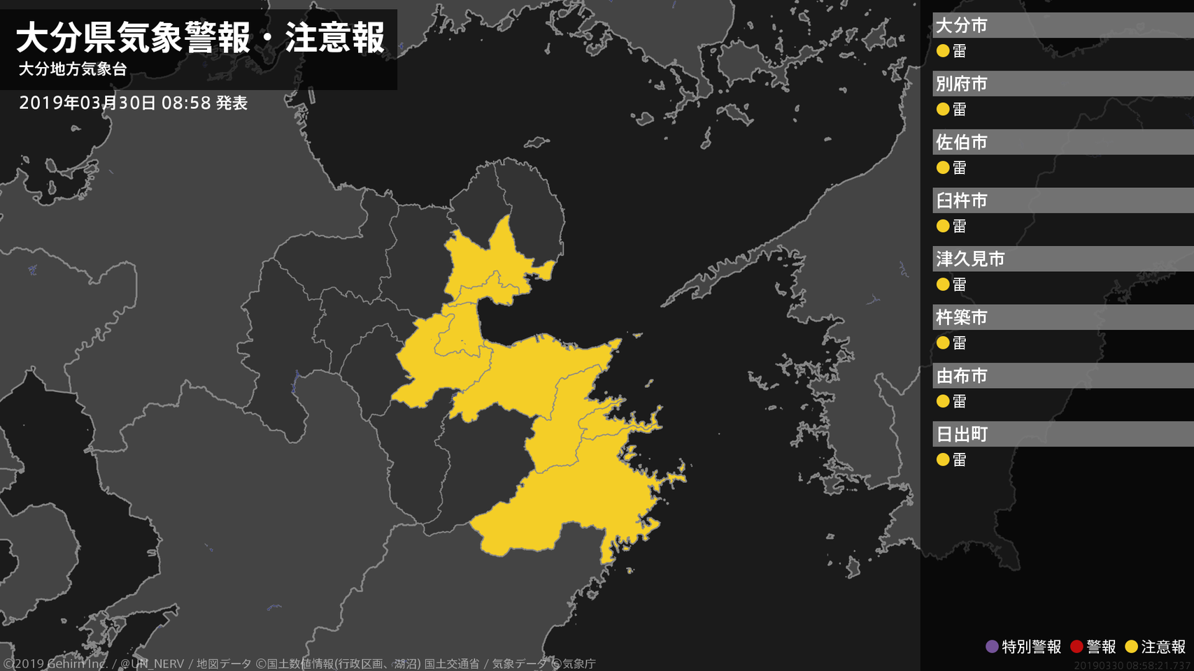 【大分県 気象警報・注意報 2019年03月30日 08:58】中部、南部では、30日昼過ぎまで急な強い雨や落雷に注意してください。#気象警報注意報 #大分県