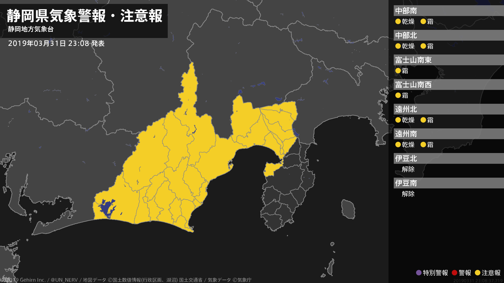 【静岡県 気象警報・注意報 2019年03月31日 23:08】中部、西部では、2日まで空気の乾燥による火の取り扱いに注意してください。中部、東部、西部では、1日朝は霜に対する農作物の管理に注意してください。#気象警報注意報 #静岡県
