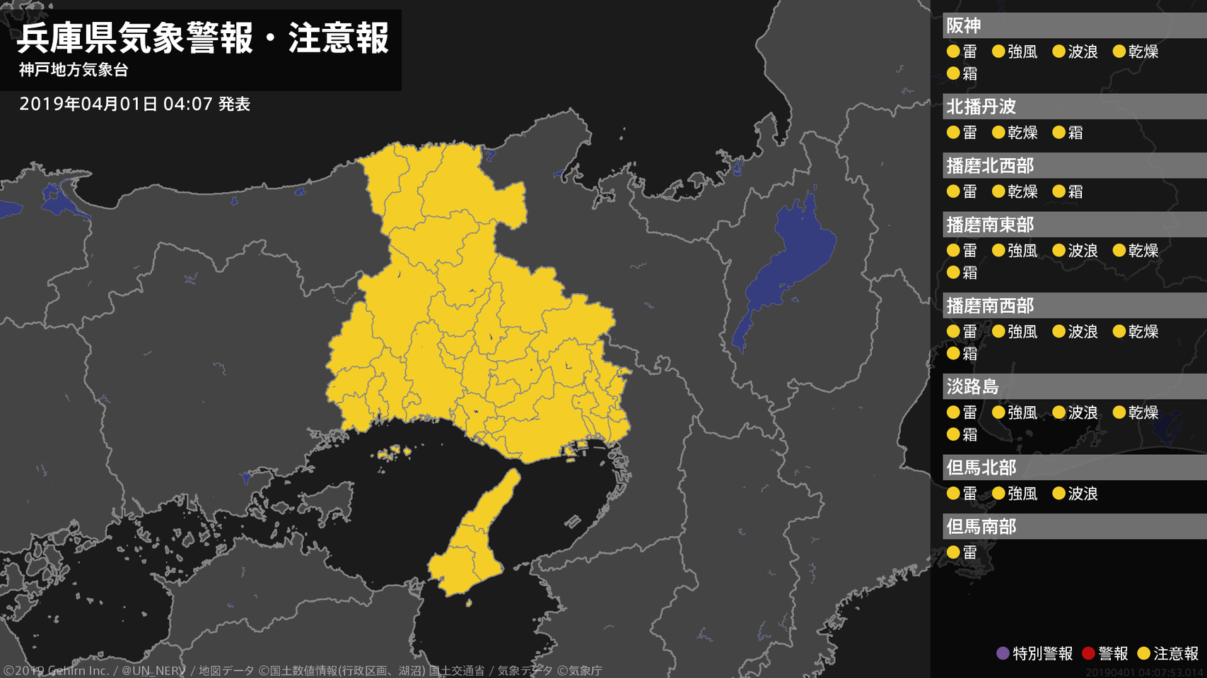 【兵庫県 気象警報・注意報 2019年04月01日 04:07】兵庫県では、強風や高波、竜巻などの激しい突風、急な強い雨、落雷に注意してください。南部では、空気の乾燥による火の取り扱いや霜に対する農作物の管理に注意してください。#気象警報注意報 #兵庫県