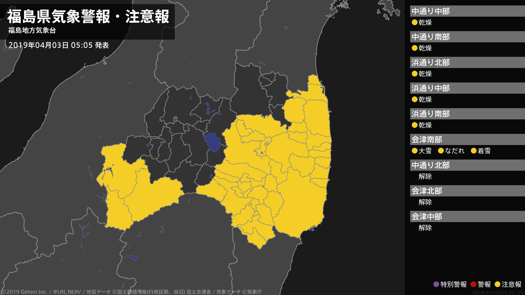 【福島県 気象警報・注意報 2019年04月03日 05:05】会津では、3日昼前まで大雪や電線等への着雪に、5日までなだれに注意してください。中通り、浜通りでは、5日まで空気の乾燥による火の取り扱いに注意してください。#気象警報注意報 #福島県