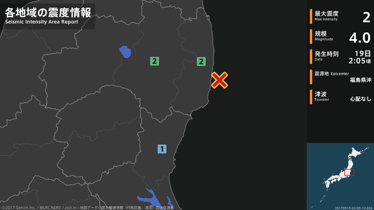 【地震情報 2017年9月19日】02時05分頃、福島県沖を震源とする地震がありました。震源の深さは約30km、地震の規模はM4.0、最大震度2を福島県で観測しています。この地震による津波の心配はありません。#地震 #福島県 #茨城県
