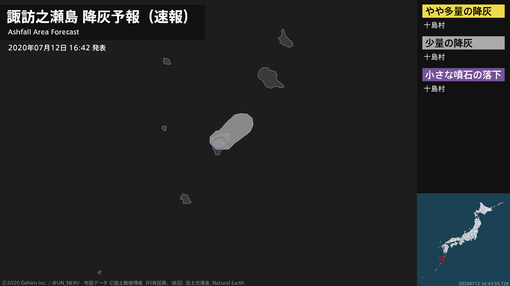 1時間以内に十島村ではやや多量の降灰があり、降灰は鹿児島県十島村まで予想されます。また、火口から南西方向およそ1kmまでの範囲では、小さな噴石が風に流されて降るおそれがあります。