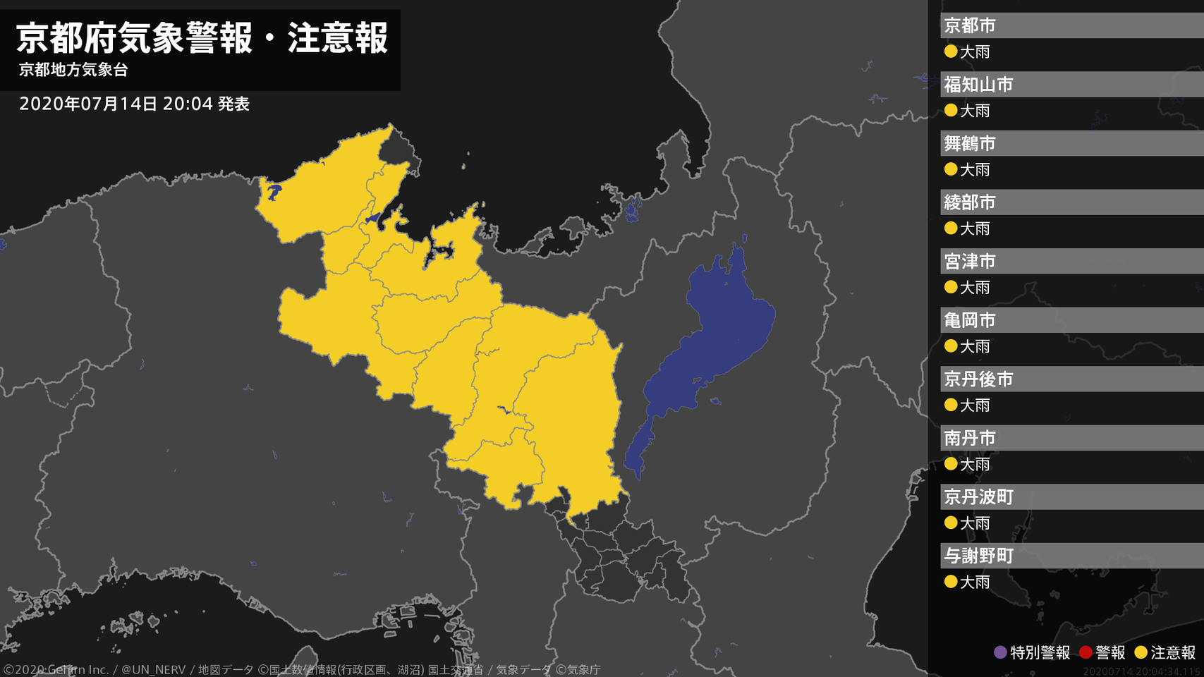 【京都府 気象警報・注意報 2020年07月14日 20:04】京都府では、14日夜遅くまで土砂災害に注意してください。#気象警報注意報 #京都府
