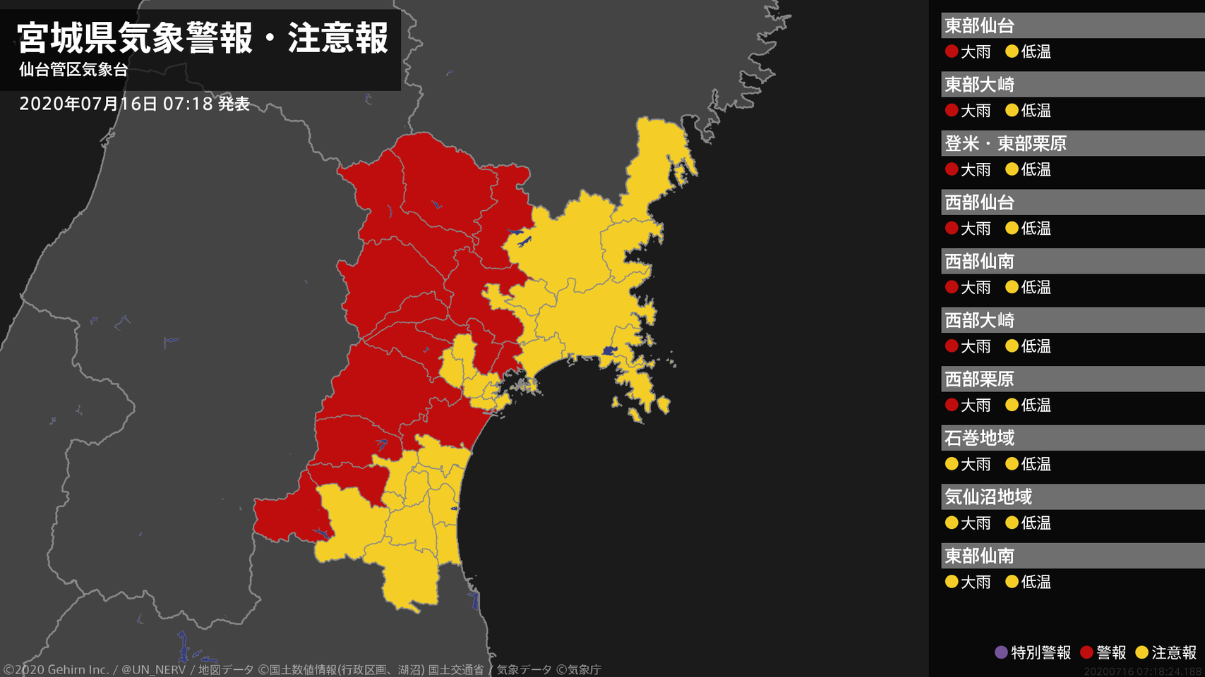 【宮城県 気象警報 2020年07月16日 07:18】宮城県では、16日昼前まで土砂災害に警戒してください。#気象警報 #気象警報注意報 #宮城県