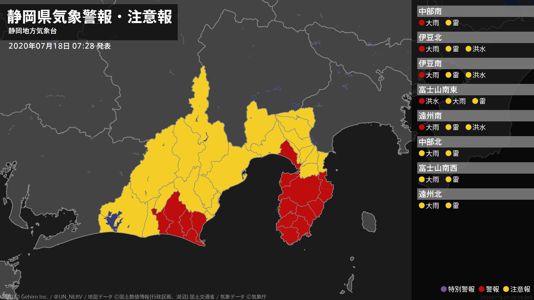 【静岡県 気象警報 2020年07月18日 07:28】中部、伊豆、西部では、18日夕方まで土砂災害に警戒してください。東部では、18日昼前まで河川の増水に警戒してください。#気象警報 #気象警報注意報 #静岡県