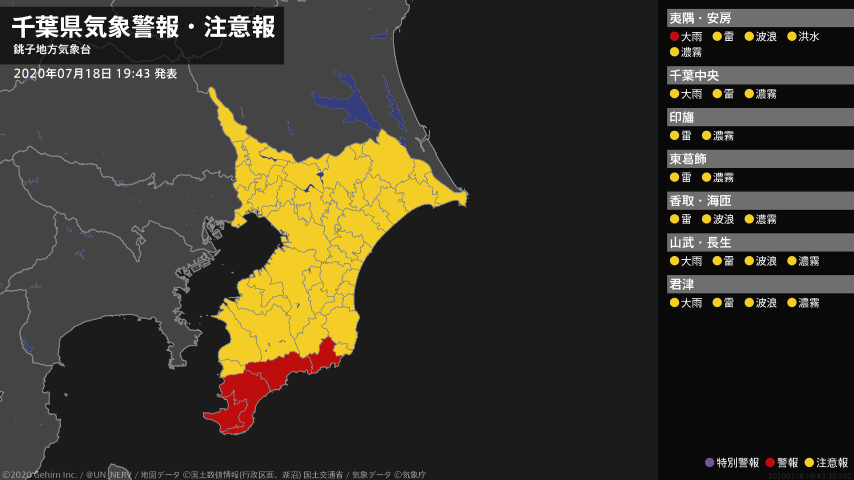 【千葉県 気象警報・注意報 2020年07月18日 19:43】