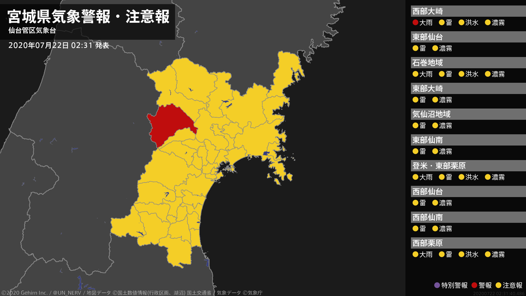 【宮城県 気象警報 2020年07月22日 02:31】西部では、22日明け方まで土砂災害に警戒してください。#気象警報 #気象警報注意報 #宮城県