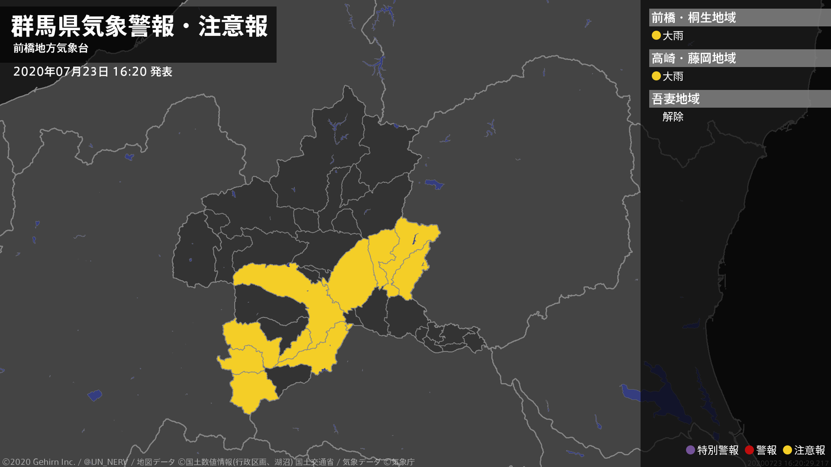 【群馬県 気象警報・注意報 2020年07月23日 16:20】南部では、23日夜遅くまで土砂災害に注意してください。#気象警報注意報 #群馬県