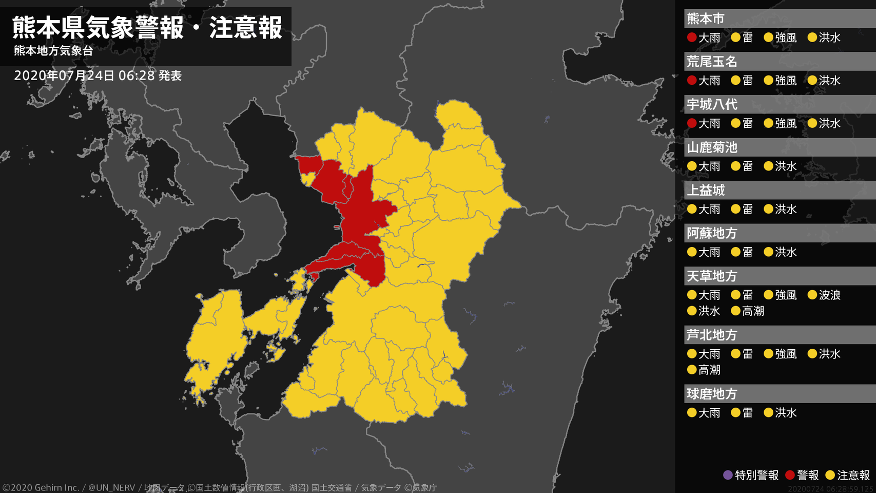 【熊本県 気象警報 2020年07月24日 06:28】熊本地方では、24日夕方まで低い土地の浸水に警戒してください。#気象警報 #気象警報注意報 #熊本県