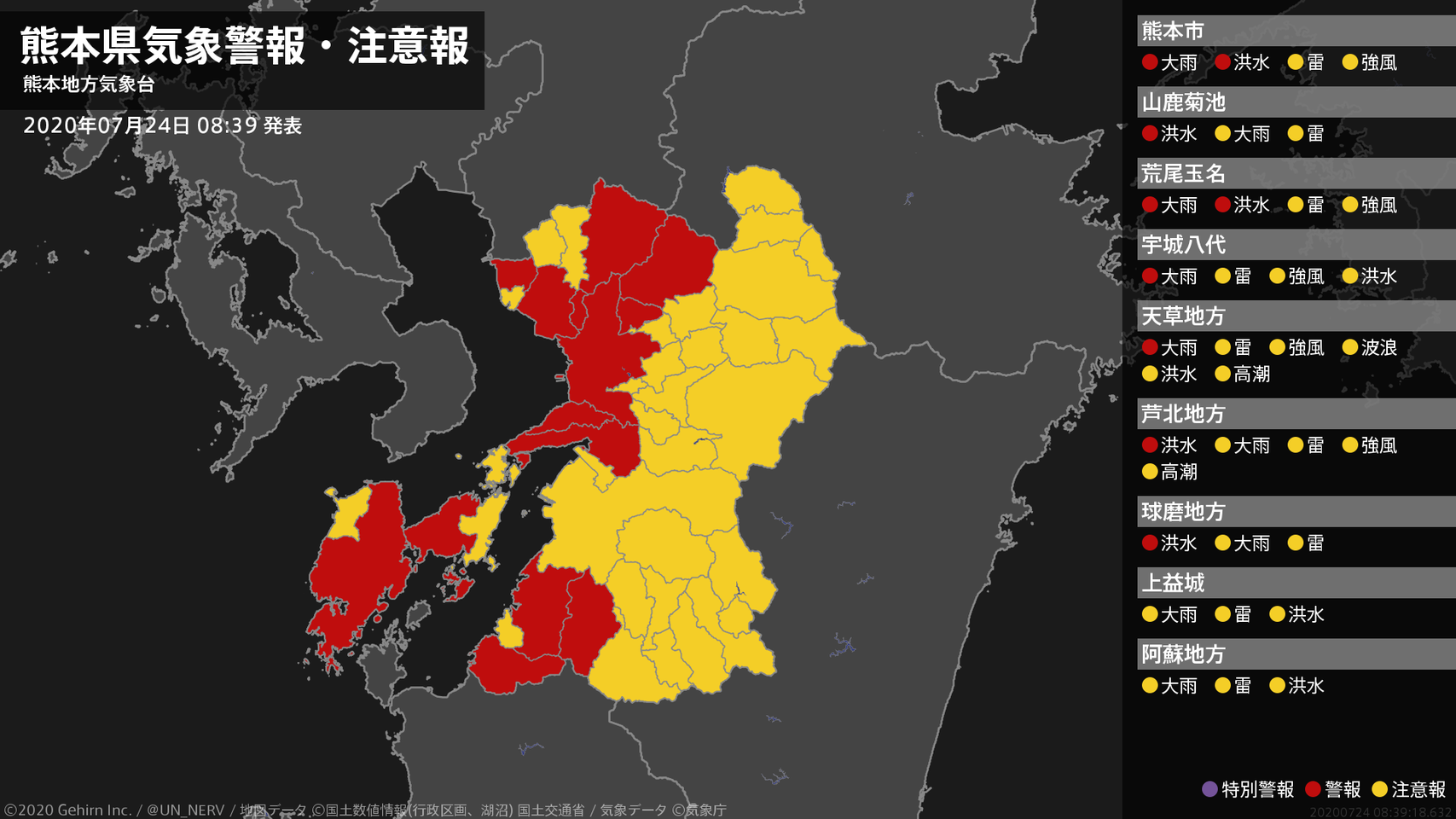 【熊本県 気象警報 2020年07月24日 08:39】熊本、天草・芦北地方では、24日夕方まで低い土地の浸水に警戒してください。熊本、天草・芦北、球磨地方では、24日夜のはじめ頃まで河川の増水に警戒してください。#気象警報 #気象警報注意報 #熊本県