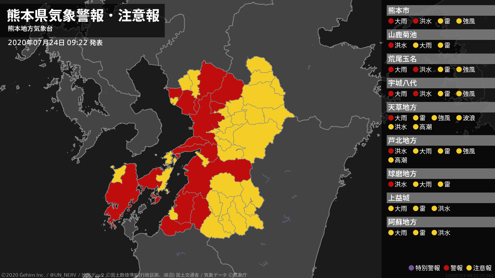 【熊本県 気象警報 2020年07月24日 09:22】熊本、天草・芦北地方では、24日夕方まで低い土地の浸水に警戒してください。熊本、天草・芦北、球磨地方では、24日夜のはじめ頃まで河川の増水に警戒してください。#気象警報 #気象警報注意報 #熊本県