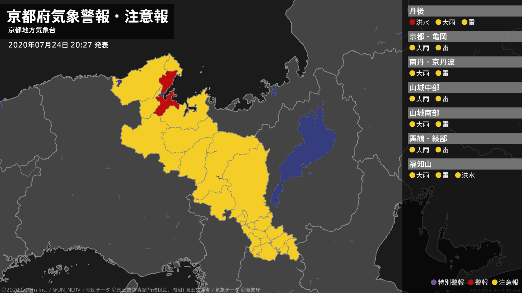 【京都府 気象警報 2020年07月24日 20:27】北部では、24日夜遅くまで河川の増水に警戒してください。#気象警報 #気象警報注意報 #京都府