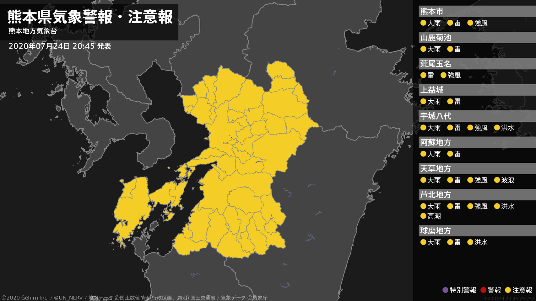 【熊本県 気象警報・注意報 2020年07月24日 20:45】熊本県では土砂災害や落雷に、熊本、天草・芦北、球磨地方では河川の増水に、熊本、天草・芦北地方では強風に、天草・芦北地方では高波や高潮に注意してください。#気象警報注意報 #熊本県