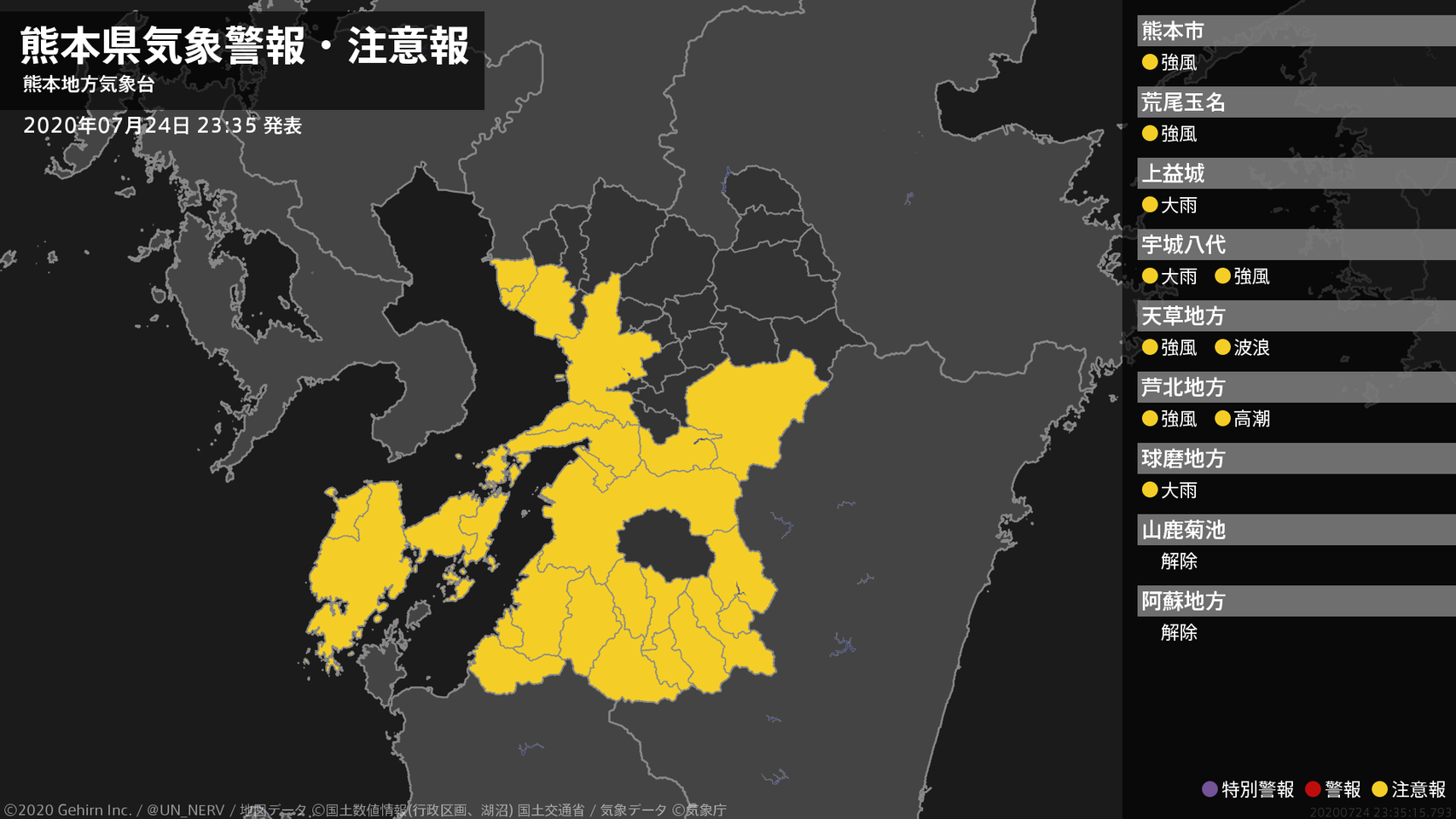 【熊本県 気象警報・注意報 2020年07月24日 23:35】熊本、球磨地方では、土砂災害に注意してください。熊本、天草・芦北地方では、強風に注意してください。天草・芦北地方では、高波や高潮に注意してください。#気象警報注意報 #熊本県