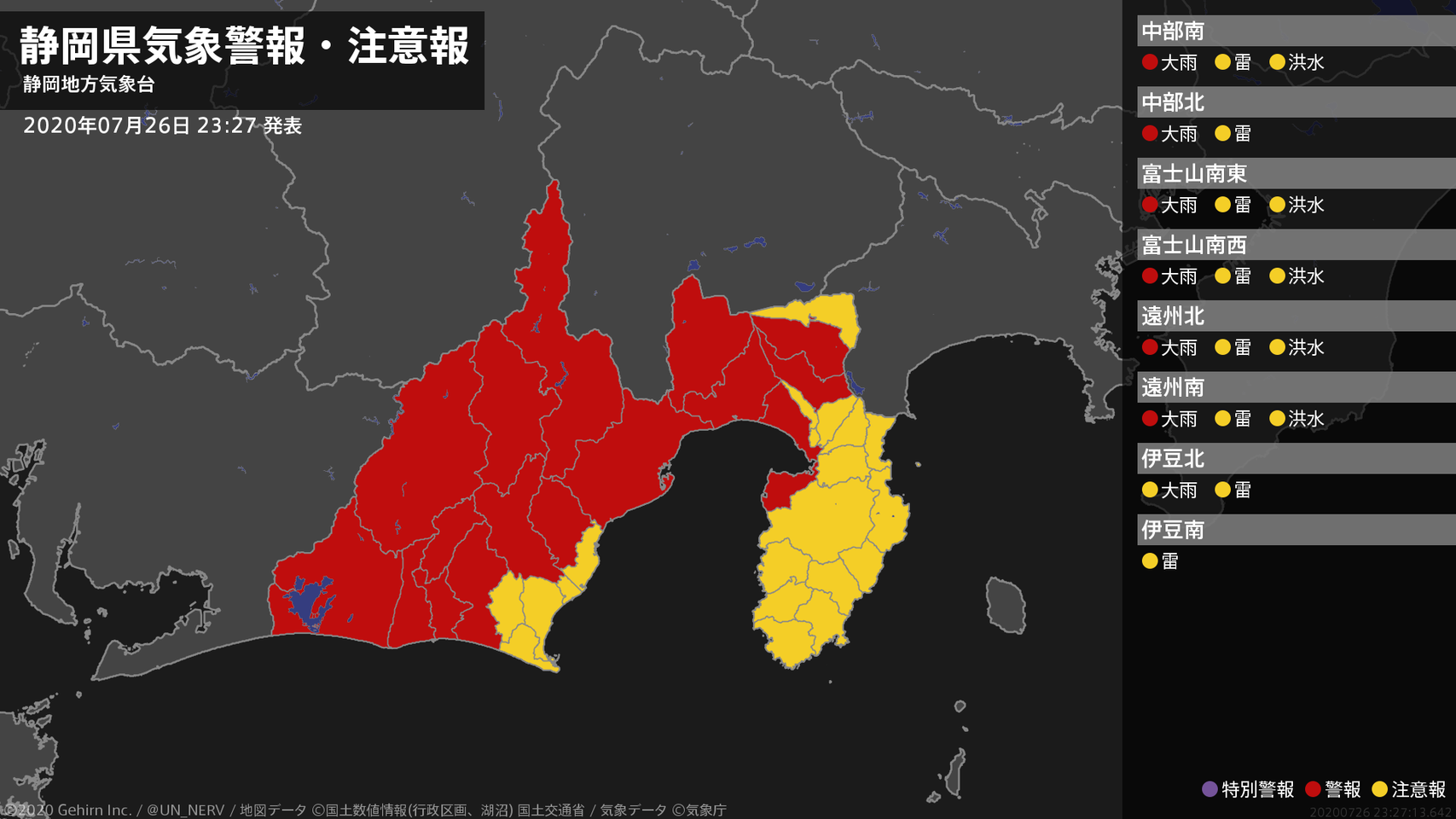 【静岡県 気象警報 2020年07月26日 23:27】中部、東部、西部では、27日昼前まで土砂災害に警戒してください。#気象警報 #気象警報注意報 #静岡県